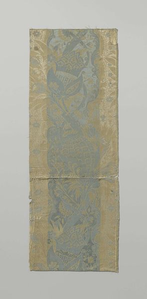 Curator: Let’s explore this intriguing “Fragment zijdeweefsel,” or "Fragment of Silk Weave" as we would say in English. Though dated from approximately 1200 to 1904, the creation process behind it remains anonymous. What are your immediate impressions? Editor: The color palette is so muted, almost ghostly. And yet, the complexity of the pattern speaks of tremendous labor. It’s both beautiful and haunting. Curator: Exactly. Let's consider that labor. This textile, or what’s left of it, hints at the meticulous craft traditions of Islamic art. It suggests an intense process of material selection and the highly skilled hands that wove the intricate design. Who were these workers? Editor: I see echoes of larger historical narratives in those patterns, especially regarding the global textile trade and colonial exploitations. We might consider who wore such fabrics, and who was systematically excluded from the same comforts and dignities. Curator: Absolutely. Even the term "Islamic Art" is complicated; its use here flattens nuances across geographic boundaries, historical moments, and countless individuals who created this art for diverse motivations. And of course the use of silk... Editor: Precisely! The fact it's a fragment also provokes reflection. It is suggestive of lives disrupted and untold, isn’t it? We could analyze it through theories of gender, class, and race. It is so rich, even as a fragment. Curator: Thinking of the material's inherent properties helps to tell the stories embedded in this remnant. It suggests complex networks of skill-sharing, the organization of craft industries, the consumption of goods and the status they conferred. Editor: These objects provide vital traces of otherwise undocumented histories, stories of resistance and subversion in their design, construction, and deployment within various social practices and events. I wonder what further stories its future can unlock. Curator: It definitely forces us to ask what survives and how. We can begin with an open mind that accounts for cultural labor, class differences and power dynamics. Editor: That's a call to look closely and challenge narratives we automatically believe as objective reality. Thank you, this was deeply enriching.