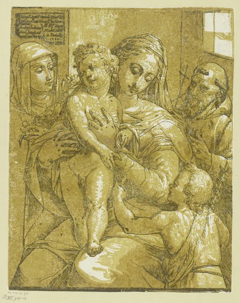 Andrea Andreani created this chiaroscuro woodcut, *Maria met het Christuskind*, sometime around 1595 in Florence. Here, the Virgin Mary is presented with the Christ Child, accompanied by Saint Elizabeth, Saint John the Baptist, and possibly Saint Joseph. The iconography of the Virgin and Child is rich with historical weight, symbolizing maternal love, divine incarnation, and the promise of salvation. Note how John the Baptist touches young Jesus, who returns the gesture, gently grabbing at John's cloak. This harks back to ancient Roman gestures of connection and continuity, a lineage that has wound its way through countless artworks, each time imbued with new layers of meaning. The emotional exchange captured in the image—the tenderness of Mary, the interaction between the children—touches something primal within us. It evokes the collective memory of familial bonds and spiritual yearning. Thus, the image is not just a depiction, but a complex node in the ongoing migration of symbols across time.