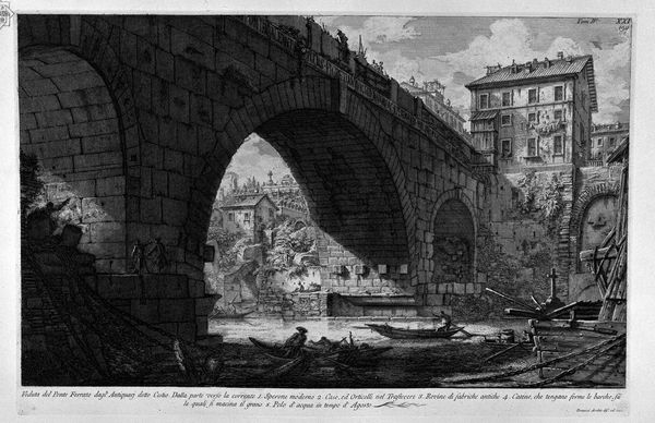 Giovanni Battista Piranesi etched "Ponte Rotto" to show an architectural study of the remains of the ancient Pons Senatorius. The print is dominated by the massive forms of the ruined bridge, rendered with meticulous detail and a dramatic contrast between light and shadow. The structure, viewed from a low angle, seems to loom over the viewer. Piranesi’s use of deeply etched lines not only defines the textures of the stone and brickwork but also evokes a sense of decay and the passage of time. The bridge is not just a representation of a physical structure, but also a statement on the transience of human achievements and the inevitable triumph of nature. In this interplay between architectural grandeur and decay, the work challenges fixed notions of beauty and permanence. It invites us to reflect on the complex relationship between past and present, structure and ruin. This challenges established meanings and invites us to interpret.