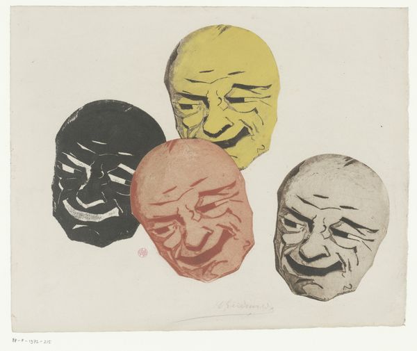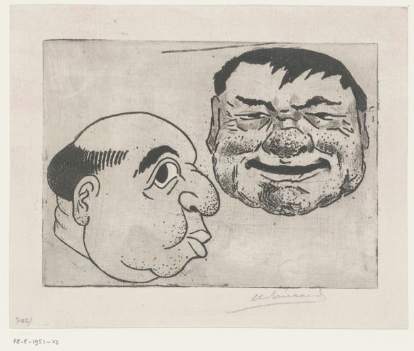 Editor: Here we have Henri-Charles Guérard's "Six Caricatural Male Heads" made between 1856 and 1897. It's an engraving, so a print made using a pretty labor-intensive process, and the faces are so expressive and distinct! What can you tell me about it from your perspective? Curator: The immediate thing that jumps out at me is how this work interrogates the divide between 'high art' portraiture and popular, accessible forms like caricature. The printmaking process itself, particularly engraving, democratized image production; copies could be reproduced en masse. What implications might this have for traditional notions of artistic value and the 'aura' of the original artwork? Editor: That's interesting, I never thought about how printmaking makes art more accessible! But how does the material relate to the social aspect you mention? Curator: Consider the kind of labor involved. Engraving is incredibly skilled and time-consuming, almost craft-like. Yet, this level of dedication is put towards *caricature*, a genre often seen as 'lowbrow.' This contrast makes us question hierarchies inherent to the art world, no? Who dictates what materials and processes are worthy of serious artistic attention, and why? Editor: I see what you mean, almost like elevating the everyday person and process… and questioning if art is supposed to be ‘serious’ at all! Curator: Precisely! Also, think about the materials themselves – copper plate, ink, paper. Their cost and accessibility would influence who could produce and consume these images. Mass production facilitated circulation to wider audiences. Editor: So by understanding the means of production we can begin to think about what the artist valued and even more the society in which he lived… Very insightful, thank you! Curator: And perhaps also consider how we consume art today in our own technological age. Food for thought.