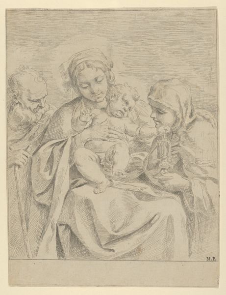 Curator: Before us we have "Study Sheet with Two Seated Children and an Angel," a drawing in ink, made sometime between 1600 and 1648, and attributed to Hendrick Goudt. It's currently part of the Metropolitan Museum of Art's collection. Editor: My first impression is one of profound tenderness, but also, maybe a subdued defiance? Look at how solidly these women are planted, even in a sketch. Curator: The maternal theme is definitely front and center. Nursing, protective, ever-watchful. Think of how the Madonna and Child image permeates the cultural memory of the West, shaping ideas of idealized motherhood, yet, this work presents them as study figures not paragons of virtue. Editor: Exactly! I read this more as a revolutionary affirmation of female strength. You have a very realistic rendering of mothers and children as human figures. These mothers look exhausted. And what’s also key to notice here is that both adults have children in need of nursing—one may even say in a clear depiction of wet nursing. The art provides dignity to a topic that's hardly ever shown, and offers social mobility to mothers. Curator: An interesting reading. Notice the symbolic contrast between the grounded figures of the women and children versus the angel floating ethereally above. Angels are very versatile figures. Do you interpret the angel as a protective presence, a symbol of divine blessing, or something else? Editor: Maybe a commentary on aspiration, or even escape. This angel offers a view to the concept of care. The angel as an externalized dream – a wish for relief from the constant demands of childcare. If these images are a portrayal of wet nurses, for instance, is the child being fed not by the natural mother, perhaps in some contexts, this externalized dream serves as a reminder of a desire for freedom from work. Curator: That perspective allows us to consider Goudt’s artistic milieu. There was growing naturalism within religious artwork in the period, an appeal to humanist principles and observations from daily life. It’s possible these ‘studies’ reflect on new visual lexicons to reimagine hallowed images like those of the Virgin Mary. Editor: I agree, placing it within the rise of humanism really lets us see how innovative these depictions really are. The sketches of each composition suggest possibilities and challenge us, even now, to reassess preconceived notions. Curator: Ultimately, a single drawing invites us into a far-reaching conversation about not only religion, but women and families as pillars of resilience and societal structures. Editor: Precisely. And prompts us to examine, even today, how such roles are acknowledged, represented, and either reinforced or defied.
