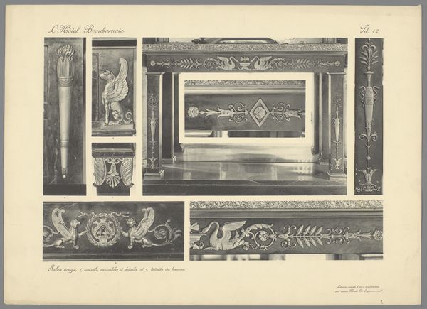 Curator: This print, dating from somewhere between 1875 and 1930, offers "Overzicht van verschillende decoratieve elementen uit de eetzaal zoals kandelaars"—an overview of various decorative elements from a dining room, such as chandeliers. It’s rendered in detailed line work. What strikes you initially? Editor: A pervasive sense of historical excess, particularly conveyed through the symmetry. Look at that elaborate archway detail in the upper left – meticulously patterned with flora motifs. The candelabras feature neoclassical heads, winged adornments, animalistic details—all rendered with intense symmetry and balance. Curator: Yes, balance is a core feature. Consider how the artist organizes the composition—multiple architectural and ornamental fragments laid out for comparative study. We can examine the candelabras as studies in lighting. Note how light would reflect off the metallic surfaces, and the way their placement might activate shadow and texture in the dining hall. Editor: Right. The function of light can signify hierarchy in the social order. The candelabras become powerful emblems of control when you place these design elements inside their social milieu. These aren't merely lighting devices, they perform power relations. Think about the labour conditions and the social strata necessary for the consumption of this gilded-age luxury. Curator: Certainly. Still, focusing strictly on composition, examine the variation across the surface ornamentation. The floral patterns are echoed on the pillars, albeit rendered more geometrically. Or how the column capitals are carved in classical motifs. Do you think these various iterations express hierarchy? Editor: The details illustrate status through ornamentation. However, consider that each emblem, motif, or form in this scene refers to a complex web of subjugation of resources, labour and life itself. We should ask—who benefitted from this meticulously ornamented setting, and at what cost? Curator: The question, in essence, speaks to the power of decorative art: its function is simultaneously to delight and to define. We can continue that inquiry while examining the interplay of symmetry and opulence—and how effectively those formal properties underscore the ideological meanings present in this period. Editor: Exactly. Appreciating these ornate details necessitates recognizing both their intrinsic artistic quality and their role in sustaining historical social orders. This is the paradox we bring with us into this drawing: delight, oppression, history and representation interlinked.
