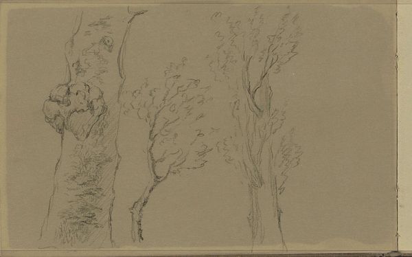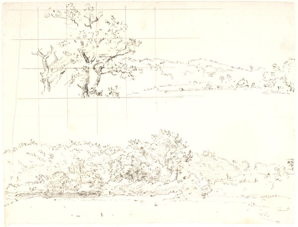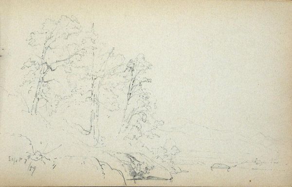 Curator: Here we have Christen Købke’s 1836 graphite drawing, "Skovlandskab med to siddende figurer i forgrunden" held in the collection of the SMK, or Statens Museum for Kunst. Editor: Oh, it’s incredibly subtle! My first thought is a whisper in pencil—like a secret the trees are sharing. Curator: Indeed. The composition strikes me as quite deliberate. Notice the foreground’s density, its movement leading into a more open and placid middle ground where the figures reside. Editor: Those figures…they’re so minimally rendered, almost ghostly. I wonder what they are looking at. There's such tranquility to them. Like two philosophers contemplating the landscape! Curator: Købke's technique exemplifies the Romantic landscape tradition. We observe a strategic use of light and shadow created solely by graphite, giving depth to a relatively simple, uncluttered drawing. He deftly creates textures, capturing a sense of atmosphere without excess detail. Editor: Yet within that restraint is so much room for imagination. The sketch-like quality feels very immediate, as if we're seeing what Købke himself saw, directly from his eyes to paper. What's most intriguing is its lack of the picturesque grandeur of traditional landscapes. There is almost genre painting’s sensibility, in that sense that he includes figuration without specific historical relevance. Curator: Precisely! There are very little details for narration, that may speak more about Købke’s focus on representing an emotional and perhaps subjective engagement with nature. And those marks there at the bottom right? It appears he lightly dated the study too. Editor: Well, for me it really feels like an invitation into that very quiet moment in nature. Almost like he created an exercise on “mindfulness” 150 years before. Curator: That’s certainly an intriguing interpretation, I must say. It just reminds us how a simple drawing can reveal a great deal, in form as well as in its aesthetic intention. Editor: Absolutely. From its understated grace to its profound impact, it's a window into a quieter, more reflective way of seeing.