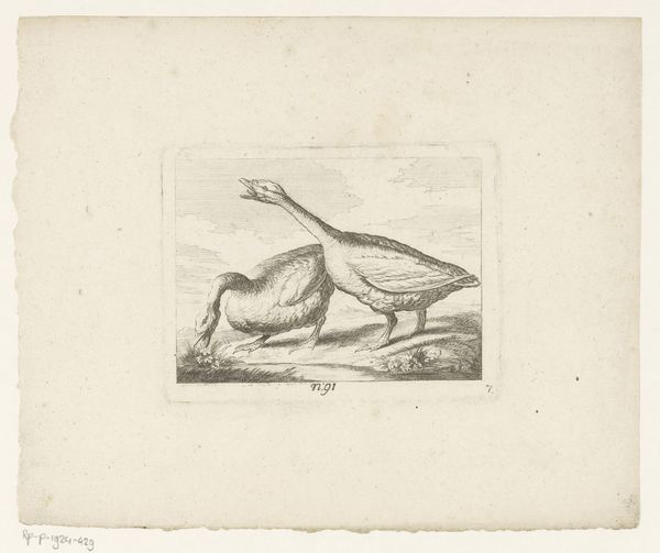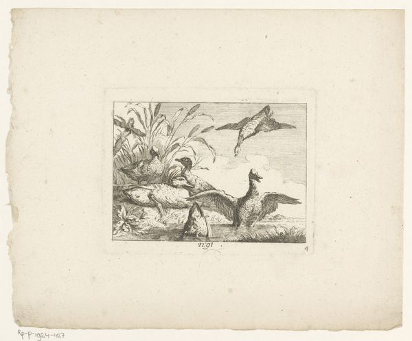Curator: This is Johann Georg Hertel’s “Landschap met vier reigers,” dating roughly from 1705 to 1775. The piece, currently held in the Rijksmuseum, is an etching. Editor: It feels almost like a quick sketch, capturing a fleeting moment in nature. The reigers, or herons, are delicately rendered. There's a sense of quiet observation, but also perhaps the raw materiality of the etched line itself comes through. Curator: Considering the historical context, Hertel was likely responding to an increased interest in naturalism. The etching process allowed for wider distribution of imagery, making landscapes accessible to a broader audience, thus shaping environmental awareness. What we should discuss is if the construction and circulation of these natural images serve colonial and extractivist projects. Editor: That’s fascinating. I’m more drawn to how the medium itself might inform the scene. The lines seem economically laid, there's an almost technical drawing-like feel, particularly with the reigers' distinct shapes and how their reflections hit the water, all captured through what must have been laborious engraving. You can almost imagine the artist hunched over the plate. Curator: It also evokes a sense of class and labor. This image romanticizes rural life. Did it engage with the actual labor of people inhabiting the depicted landscapes? What we perceive as nature is invariably culturally and historically mediated through those things. Editor: Indeed, it presents nature as a site of serenity. Considering the intended audience, perhaps the etching served as a reminder of something tangible and accessible even as industrial life emerged and labor intensified in cities. The print could also act as an exercise for artisans or beginner draftsmen, which is often something we forget to think about when looking at works such as these. Curator: We could consider its visual dialogue with earlier landscape traditions and even its function in colonial projects of claiming and documenting. By whom, how, and for whom were these prints made? What implications did they carry then, and now? Editor: This exercise emphasizes what initially appears as a peaceful landscape scene reveals underlying tension and materiality. Curator: Yes. This reminds us of the layers of meaning embedded in even seemingly straightforward depictions.