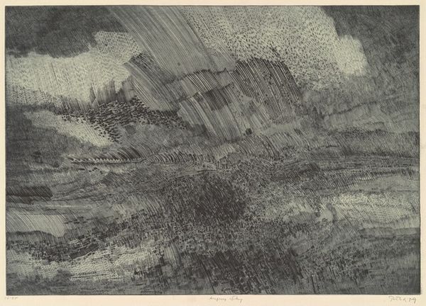 Curator: We're standing before Hercules Segers's "Rocky Landscape with a Gorge, First Version," an etching created circa 1625 to 1630. Editor: Immediately, I'm struck by the palpable sense of isolation. The color is somber and the landscape feels otherworldly, even forbidding. Curator: That emotional impact, I believe, is precisely what Segers was after. Consider the symbolism inherent in such a stark, unforgiving environment. The barren rocks, the implied struggle for survival… these visuals would deeply resonate with viewers, calling forth archetypal themes of endurance and fate. Editor: Perhaps. But I'm more intrigued by how Segers achieved this effect materially. Look at the rough, uneven lines, the varying depths of the etching. It's clear he wasn’t just interested in representing a landscape. It seems like he wanted to actively participate in shaping the visual and tactile qualities of the print. He was deeply engaged in the craft itself. Curator: Absolutely, and that tactile quality reinforces the primal feel. Note how that windmill nestles precariously at the bottom left. Its vulnerability emphasizes human dependence on larger forces, a theme consistent across various cultures who represent our small place in the cosmos. Editor: Agreed. The smallness of the mill emphasizes the grandness of the landscape, a sublime vision that only materials could properly evoke. How many different states did Segers pull this print through, continually reworking the plate? And what about the inks he used – where did he source them, how did he mix them to get these unusual tonalities? Curator: Segers did reportedly experiment extensively with printing techniques, altering colors, and even hand-coloring impressions, making each print unique. That almost obsessive approach makes sense if you think of the landscape itself as a metaphor for internal exploration, mirroring the twists and turns of the human psyche. Editor: I appreciate the connection between internal process and external landscape here. Perhaps Segers’ intense engagement with material reflected his attempts to uncover nature’s deepest secrets. It reminds us that even a seemingly desolate scene can hold a rich story, grounded in labor and raw matter. Curator: It invites a journey through not only landscape, but into a deeper reflection of our place within it. Editor: Absolutely. "Rocky Landscape" resonates beyond aesthetics and directs us to contemplate the intersection of skill and meaning embedded in such visual relics.