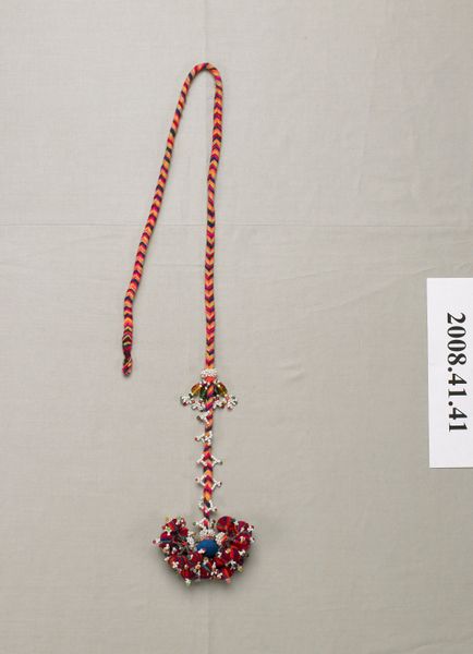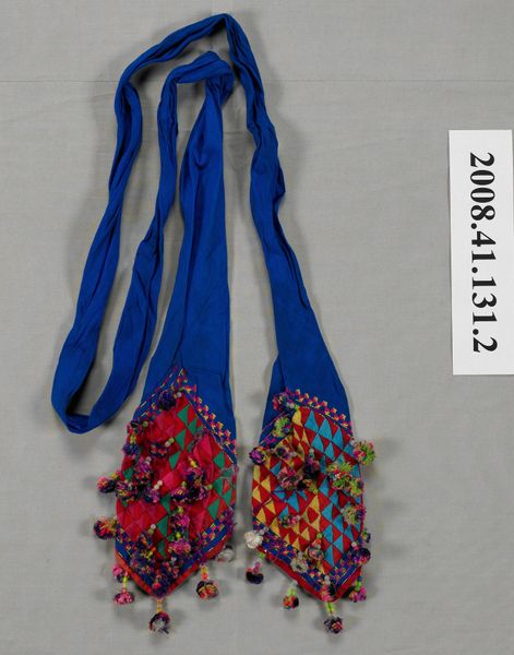 Curator: This piece is identified as a Woman's hair ornament, dating to the 1970s. Editor: Well, the most immediate thing that strikes me is the symmetry, or perhaps a near-symmetry, offset by the incredible play of color and texture. It’s lively. Curator: It certainly presents a vibrant cultural expression, a key element within the context of traditional Jat adornment. Ornaments such as these often carried social significance, denoting marital status, ethnic affiliation, and economic standing. Editor: That's fascinating! Focusing on the formal elements, I am particularly drawn to the way the striped orbs at the bottom, with their radial arrangement of color, ground the entire composition, providing a counterpoint to the more airy and seemingly haphazard arrangement of beads and tassels above. Curator: Precisely. Considering its role in expressing identity, these are never "haphazard." The very deliberate craftsmanship tells us a great deal about the artist, especially when viewed within gendered expectations and labor. We also understand it in relation to social codes and symbolic representation within Jat culture. Editor: True, although it is also a delightful assemblage of varied elements - fibers, beads, playful arrangements and that dark braid that leads our eyes in. It presents the very essence of materiality in its intricate construction and use of texture. It seems the choice and order of these components create visual interest for the wearer. Curator: Exactly. Understanding the symbolic meanings inherent in those materials – each bead, each knot – offers deeper insight into the identity of the woman who wore this and her role within the broader societal framework of her community. We're also thinking of resistance as she navigates historical events. Editor: Agreed, it shows just how intrinsic form and function are. So beautiful and useful. Curator: Yes, exactly, bringing focus to the ornament's powerful reflection on cultural pride and individuality.