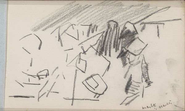 Editor: This is "Studie," a graphite and pencil drawing by George Hendrik Breitner, made sometime between 1886 and 1923. It’s currently held at the Rijksmuseum. I'm struck by the simplicity of the lines; it almost feels like a fleeting thought captured on paper. What stands out to you in terms of composition and form? Curator: Indeed. Immediately, I observe the distinct division of space. Note the stark contrast between the dense, almost chaotic scribbles at the top of the page and the relatively sparser, linear marks delineating the lower portion. Ask yourself, how does this division affect our reading of the piece? Does it suggest a landscape? Is it representational, or more abstract? Editor: I can definitely see a landscape with what looks like light breaking through some heavy clouds... maybe a sunrise or sunset. So, how do you reconcile the sketch-like quality with the possibility of it being a “finished” landscape? Curator: "Finished" is a loaded term, isn't it? From a formalist perspective, the beauty lies in the artist's process being laid bare. We see the artist grappling with form, light, and shadow. Observe how the lines themselves create depth and texture despite their seeming simplicity. Is the essence of the landscape captured not in meticulous detail, but in the energy of the line itself? Consider this: does the incompleteness invite our active participation as viewers, prompting us to fill in the gaps and complete the image ourselves? Editor: That’s a really interesting point! It's less about the “what” and more about the “how.” Thanks, that's given me a whole new appreciation for seeing the artistry in even unfinished sketches. Curator: Precisely. Formal analysis encourages us to appreciate the inherent visual language of art, stripping away preconceived notions of subject matter or intention. An invaluable tool for understanding visual art, wouldn’t you agree?