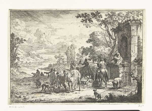 Curator: This line engraving by Franciscus de Bargas, titled "Landscape with Dancing Man and Woman and Bagpipe Player near Ruins," was created sometime between 1660 and 1699. It presents quite a scene. Editor: It does! It almost vibrates with frenetic energy. There’s a sense of playful chaos to the composition. It's not immediately clear where to focus. The dark and light areas push and pull you across the image. Curator: Indeed. De Bargas was working within the established tradition of genre scenes, catering to a market keen on depictions of everyday life, often romanticized or moralized. Consider how the ruins subtly juxtapose against the revelry. They hint at the passage of time and perhaps even the fleeting nature of joy. Editor: That juxtaposition you point out brings an element of the sublime to the seemingly carefree depiction of music and dance, infusing the image with tension and maybe even grief, challenging idealized notions of pastoral life. The very material of the work, an engraving, speaks to the accessibility of these images to a broad audience. It underscores a developing early democratization of visual culture. Curator: Precisely. Furthermore, the choice to include dancing peasants raises interesting questions about class and representation during this period. Who was consuming these images and what did they signify to them? Was it an appreciation of rustic life, or was it meant to be a form of satire? Editor: Or was it intended to simply romanticize it all? The gendering of labor also is quite visible with women appearing to actively enjoy folk life in direct correlation with masculine authority over instrumentation and performance. The lack of agency here really highlights cultural paradigms in need of disruption. Curator: The ambiguity itself makes the piece so compelling. This seemingly simple scene is pregnant with social and historical context. The landscape is as much a cultural construct as it is a natural one. Editor: This certainly provides plenty of fodder to investigate the intricacies of cultural representation through a feminist lens, while understanding broader societal impacts and potential power dynamics. Curator: It really is quite multifaceted isn’t it. It challenges us to delve beyond the surface to uncover the layers of meaning embedded in this Baroque landscape. Editor: Yes. Thank you for expanding my reading of de Bargas’ work!