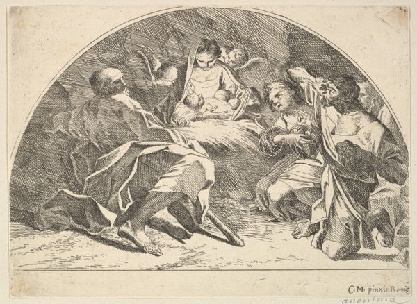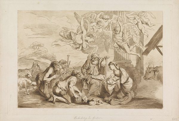 Editor: This is Francis Legat's "King Lear: Act V, sc. 3," a somber scene etched sometime around the late 18th century. The weight of grief is palpable. What can you tell us about how this image interacts with the play's historical context? Curator: Legat’s engraving translates Shakespeare’s tragedy into a public, consumable image. The play, though written earlier, saw various interpretations on stage. Legat’s version, distributed through prints, helped solidify a visual language for representing Lear's madness and the cost of ambition within the evolving social and political landscape of the 18th century. Consider the role engravings played in disseminating cultural narratives and values at the time. Editor: So it's not just about the play, but about how society understood it? Curator: Precisely. The artwork reflects the societal interpretation and dissemination of Shakespeare's work, shaping its ongoing cultural resonance. Legat's piece offers a window into the artistic and political forces at play in his era.