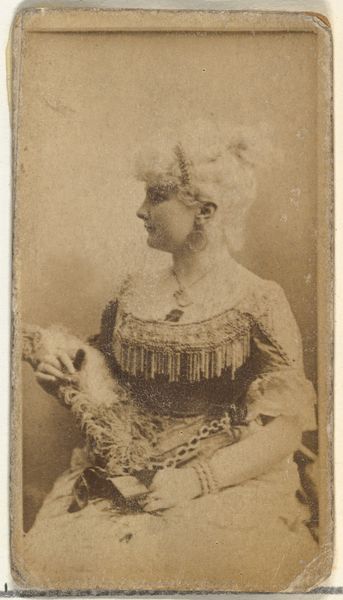 This small card, “Card Number 354, Netta Byron,” was produced by W. Duke, Sons & Co. as a promotional item for Cross Cut Cigarettes. The sepia tones and compact size create an intimate viewing experience, almost like a miniature portrait capturing a moment in time. Examining the composition, we see a full figure portrait where the actress is standing in front of a blurred landscape. The arrangement of her body and clothing create a play of light and shadow, the textures of her dress, hat and ruffles are highlighted by the photographic process. The image also acts as a sign within a larger cultural text. Cigarette cards were popular collectibles, functioning both as advertising and as a means of circulating images of contemporary celebrities. This reflects a late 19th-century obsession with fame and consumer culture, where an actress's image becomes a commodity, linked to the consumption of tobacco. The card functions as a token of both aspiration and accessibility, offering a glimpse into the world of entertainment while promoting a specific brand.