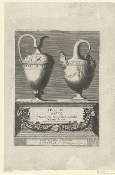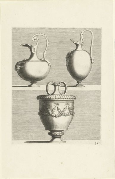 Françoise Bouzonnet created this print of three ewers. It’s a striking example of the way printmaking could disseminate designs for metalwork. Notice the contrast between the precise, linear quality of the engraving and the implied volume of the ewers. This tension is key to understanding the image. The drawing is a type of design blueprint, giving a sense of how light would reflect off the finished forms. The texture, weight, and overall form of the ewers are all communicated through this skilled application of line. Bouzonnet was not just creating an image; she was participating in a wider system of production and consumption. Highly skilled silversmiths would have taken prints like these and used them as inspiration for their own creations. The print, therefore, bridges the gap between artistic concept and material reality, a reminder of the many hands involved in bringing such objects to life. Ultimately, this print invites us to think about design not as an isolated act of creation, but as a collaborative, socially embedded process.