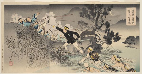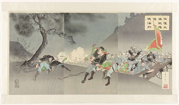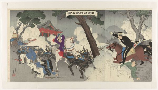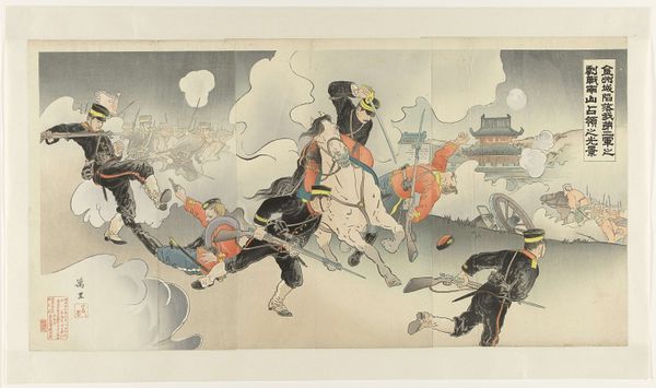 Curator: I see mostly shades of grey, which gives it a somber and intense quality. The details seem so far away, as if observed from above through the storm clouds. Editor: You're absolutely right. This triptych woodblock print, titled 'Fierce Fighting at Pyongyang Displays Japan's Military Prowess to Foreign Countries,' by Fujiwara Den'ichi, created around 1894, uses those muted colors so effectively. It's currently part of the Rijksmuseum collection. And while watercolor-like, it is important to remember that color prints during that period depended upon the skills of the woodblock carvers and printers to be successful. Curator: "Military prowess," hmm? It almost feels contradictory, given the grey palette I noticed right away. It looks quite devastating, like they are fighting the elements as much as the enemy. Editor: Exactly. This work emerged during the First Sino-Japanese War. What’s intriguing is how these prints served a dual purpose: documenting events and shaping public opinion back home, in this case, romanticizing military action while acknowledging the grit of war. Curator: I always find that dichotomy in war art fascinating – this need to glorify something inherently destructive. Notice how the eye is drawn to that striking red flag amidst all the muted tones? It is the one aspect of glory the artists wants us to focus on. Editor: And how the composition subtly directs our gaze from left to right, almost choreographing the battle’s progression? There's this undeniable propagandistic element, highlighting order and strategic movement amid the chaos. Also note how it is specifically created to display Japan's growing global position to Western countries at the time. Curator: Yes! It almost transforms this chaotic battle into a well-staged spectacle. Almost desensitizing its viewer to the actual cost of human lives involved. A difficult balancing act to successfully glorify devastation and pain with the beauty and finesse of its rendering, which this artwork certainly accomplishes. Editor: Absolutely. It reflects how art functions not just as a mirror, but also as a tool in constructing collective memory and national identity, with careful considerations about the artwork's potential for export to a European audience. Fujiwara, here, reminds us that behind every heroic narrative lies a far more complicated truth, where it is hard to tell which action leads to prosperity or more problems for each of the players involved. Curator: I’m left pondering the human element lost in the grandeur. I leave with so much more to consider. Thank you! Editor: Likewise. A crucial reminder of how artistic expression intersects with historical narratives, personal emotion and international audiences, always asking us to see the deeper complexities beneath.