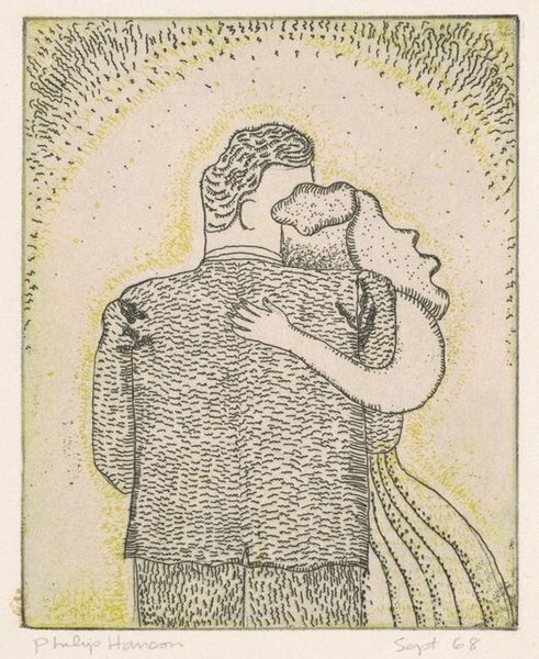 Editor: Dame Elisabeth Frink’s "The Squire's Tale" features a woman and a bird of prey. It feels very stark and a little haunting. What does this pairing evoke for you? Curator: Frink's work often explored themes of power, vulnerability, and the human condition, particularly in a postwar context. Consider the position of women during the time and the symbolism of the falcon - a bird often associated with nobility and hunting - held in check. What could that juxtaposition suggest about female agency? Editor: I hadn't thought about it in those terms, but it brings the work into focus. Curator: Precisely. By thinking about the intersection of gender, class, and historical power structures, we can unpack the print’s deeper meanings. Editor: Thank you. I see so much more now! Curator: Absolutely, a work that considers the many ways women have been represented and their roles.