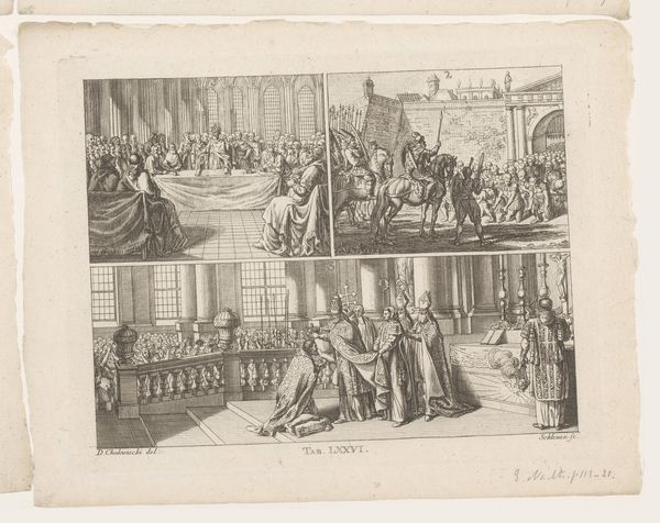 Bernard Picart created this print titled "Rooms-katholieke rouwstoet, uitvaartsdienst en begrafenis" using engraving techniques. The composition is divided into three horizontal panels, each depicting a stage of a Roman Catholic funeral. The detailed use of line creates a textured surface, defining the architecture, clothing, and figures. The tonal range, achieved through varying densities of line, enhances the emotional weight of the scene. Each panel presents a distinct spatial arrangement. The upper panel shows the funeral procession outdoors. Below, the middle panel captures the solemnity of the body laid out in the choir. The bottom panel depicts the conclusion of the ceremony, where holy water is sprinkled. The organization of these panels creates a narrative flow, guiding the viewer through the ritual. Picart uses a semiotic structure to convey the cultural codes and religious values associated with death and mourning, inviting us to consider the structured rituals that frame human experiences.