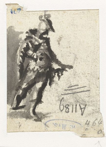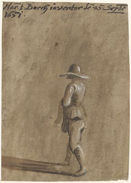 Editor: This is a quick ink and pencil sketch on paper from the Dutch Golden Age, "Sketch of a Boy Walking to the Right" by Harmen ter Borch, probably done between 1651 and 1659. It has such an unassuming presence; what do you see in this piece, someone rapidly captured or observed? Curator: Yes, observed moments hold so much, don’t they? Notice the hat. A broad-brimmed hat, slightly tilted. What does that suggest? Think about sun protection, but also concealment, a wish not to be directly seen. Does the figure seem burdened by shadow, the weight of unseen expectations perhaps? Editor: I hadn't thought of it like that, focusing instead on the simple depiction of movement. Curator: But what *kind* of movement? Is he striding confidently, or shuffling with reluctance? The lines themselves carry weight, don’t they? Look at how Ter Borch renders the boy's leg – that single firm stroke, contrasting with the sketchier lines around the torso. Is it symbolic of groundedness, contrasting a more ephemeral spirit? Editor: The contrast in line work does change things... it brings forth that dichotomy. The boy, caught between a solid presence and something fleeting. Curator: Indeed! What else speaks to you of that conflict? His back is to us, withholding, yet his head is turned, suggesting invitation. The image is speaking to both turning away, and being seen, a universal visual conflict. The cultural memory, the idea of youthful ambivalence is communicated, what will he do? Where will he go? What burden does he carry? Editor: I never considered that much was embedded within such quick strokes. Thanks for this fresh insight. Curator: My pleasure, a simple sketch revealing hidden depths, isn't that the marvel of visual expression?