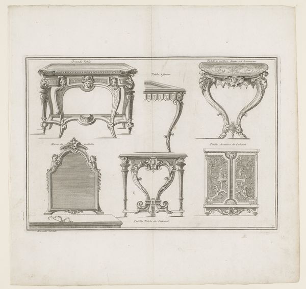 Curator: I see a gathering of ghostly furniture... are these apparitions from a Baroque manor? Editor: Close! What we have here is an engraving titled "Diverse meubels," or "Various Furniture," dating from around 1710 to 1720. It's attributed to André Charles Boulle, known for his opulent furniture designs. It’s rendered with a remarkable precision, typical of his design drawings. Curator: "Opulent" is spot on. They appear to be drawn with the air of a reverie. Each leg, curve and flourish is detailed with the intent of invoking a particular feeling and inviting the mind's engagement. Like frozen music, waiting to be animated, perhaps? Editor: That’s a lovely image, truly! And apt, considering Boulle’s influence. This print wasn't necessarily intended as a literal instruction manual but rather as a demonstration of his artistry and a kind of catalogue of design possibilities for potential clients and other artisans. Curator: Ah, so it’s part showroom, part manifesto! Looking at it now, I see each piece practically overflowing with symbolism... a lion’s head here, a floral flourish there. Was all that ornamentation purely decorative? Editor: While undeniably beautiful, the ornament served as more than mere decoration. These motifs reflected the wealth, taste, and status of the patrons who commissioned such pieces, fitting in neatly within the grand spectacle of Baroque courtly life. Think Louis XIV, and you get the picture. Curator: It’s as if each piece is making its own pronouncements! "I am important!" one cries, "I am refined!" another whispers, hinting at the social theater it once inhabited, and the echoes linger here. Even divorced from the touch of hand on wood. Editor: Precisely. These objects weren't merely functional; they were embodiments of power, artistry and, yes, even aspiration. Seeing them here on the page prompts us to reconsider how art objects function within culture. Curator: Thanks. Puts the ghost stories to rest… at least for now. Editor: Agreed. Though, even knowing its history, there is still some magic at play here.