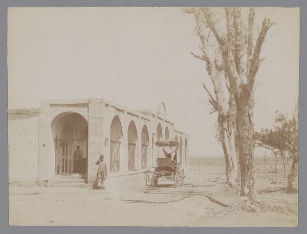 Editor: We're looking at "Landschap en gebouw [moskee?], 'La route de Rescht', Iran," a photograph by Antoine Sevruguin, taken sometime between 1885 and 1910. It’s got a very calm, almost still quality to it. What structural elements stand out to you? Curator: The careful arrangement of space is compelling. Observe how the foreground trees act as a screen, partially obscuring yet simultaneously framing the building behind. This creates a layered effect, drawing the eye into the composition through controlled visual stages. Editor: Yes, I notice the rhythm created by the trees contrasting with the architecture's linearity. Curator: Precisely. Consider also the tonal range. Sevruguin's limited palette of browns and whites is crucial, flattening the image and emphasizing form over color. How does this constraint affect your interpretation of the image? Editor: I suppose it forces you to consider shape and form, line and shadow, because you can't rely on vibrant colors. There's an almost diagrammatic quality to it. It's about pure structure. Curator: Exactly! And notice how the eye is lead in a series of steps towards the horizon, a line interrupted at its leftmost side by organic treeforms and by strict geometry at its rightmost portion via its structured roof. The balance within its composition makes us consider its qualities as a human document. Editor: It’s been fascinating to consider how such careful arrangement changes one’s experience. Curator: Indeed. This close reading highlights the artistry present even within a documentary-style photograph. Paying attention to an artwork's pure forms allows for diverse interpretation of their meanings.