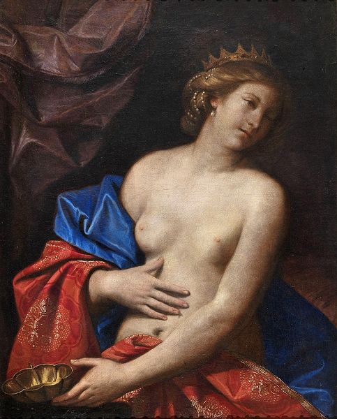 Felice Ramelli created this small painting on copper entitled "Jozef en de vrouw van Potifar," an Old Testament story, sometime between the late 17th and early 18th century. Ramelli was active in a historical moment where the cultural elite still very much set the tone for the rest of society. The scene captures the moment when Potiphar's wife attempts to seduce Joseph. Her pale, bare skin contrasts starkly with Joseph's covered body and his expression of distress. This portrayal reflects the period's views on gender and morality, where female desire was often depicted as a dangerous force. The narrative suggests that Joseph’s virtue lies in his refusal, reinforcing the patriarchal structures which prevailed at the time. The opulence of the setting, complete with heavy drapes and cherubic figures, further emphasizes the power dynamics at play. The painting provides insight into the era’s social and moral codes. It invites us to consider the lasting impacts of these historical representations on contemporary discussions about consent, power, and gender.