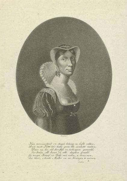 Willem van Senus created this portrait of Wilhelmina Frederica Louisa, Queen of the Netherlands, using etching techniques. Observe how the composition emphasizes verticality, lending the Queen a sense of formality, while the soft, diffused light sculpts her features, adding depth to the image. The linear precision of the etching captures the intricate details of her attire, from the delicate lace collar to the ornate jewelry, which contrast against the smooth expanse of her skin. The contrast between light and shadow isn't just aesthetic; it's a semiotic code. The Queen's portrayal adheres to established conventions of royal portraiture, reinforcing her status through carefully constructed visual cues. Yet, the starkness of the etching also introduces a certain austerity, challenging the expected opulence associated with royalty. Consider the interplay between artistic representation and social construction. Senus’ etching captures a moment in time, but its significance extends beyond mere likeness. It's a cultural artifact that participates in the ongoing interpretation of power, identity, and representation.