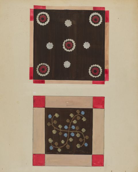 Editor: Here we have Cora Parker's "Pie Plate and Cup Plate," created around 1938 using watercolor and ceramic. It strikes me as a fairly straightforward design study, quite decorative and feminine, given the floral motifs and the prominence of the colour pink. How do you interpret this work? Curator: It's easy to dismiss this as merely decorative, but Parker's work taps into complex social and historical contexts. Consider the era: the late 1930s, during the Great Depression. The emphasis on domestic objects, like pie plates and cup plates, speaks to a renewed focus on home and hearth, traditional gender roles, and finding beauty in everyday life when resources were scarce. Do you notice the architectural elements sketched alongside the plates? Editor: Yes, those little outline sketches on either side. Are they part of the same artwork or added later, by someone else? Curator: They appear to be contemporaneous with the ceramic designs, included to situate the decorated plate as part of interior schemes. The rise of industrialization allowed mass production, making decorative arts more accessible but, at the same time, arguably diminishing the value and social status of the applied artist. In her pieces, Parker elevated decorative designs. Her chosen media is also noteworthy: using watercolor to capture the colours and patterns suggests a valuing of a distinctly female artform, particularly given watercolours association with feminine pastimes, whilst nodding to more recent forms. This links her practice firmly to that of her peers. Parker negotiates traditional gender roles through her elevation of ceramic pattern design within the male-dominated industrial context. Editor: That makes a lot of sense! I never considered how deeply embedded those simple objects and choices of representation are within their historical context. Curator: Precisely. By considering social factors, we start to grasp that even apparently innocuous pieces engage with pressing questions surrounding domesticity and identity. Editor: I see how Parker's designs speak volumes about a period and a certain societal positioning. I’ll definitely think differently about ‘decorative’ art going forward.