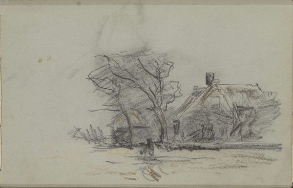 Curator: Here we have Georges Michel's "Huis met uithangbord," dating from 1773 to 1843. A simple pencil drawing. The most romantic suggestion of a humble home. What do you see first? Editor: Dilapidation, perhaps? A sort of ghostly air hangs over it. See how faintly it’s rendered – just whispers of pencil on paper. Curator: Right. Michel wasn’t aiming for photographic precision, of course. It’s more about capturing a mood, a sense of place tinged with melancholy. Look at the gallows-like structure extending from the roof—a detail almost like a medieval woodcut! Editor: That 'gallows-like structure' is key. What was produced or sold there? Where did those materials originate, and what processes shaped them? Curator: Interesting question! Michel probably wouldn't have pondered that. He was enthralled by landscape's capacity for dramatic light and weather effects, very much in the Romantic style. His drawings were often made *after* observing the landscape, so he captured the essence more than literal detail. Editor: I imagine Michel’s Romantic gaze transformed labor and the gritty processes of production into bucolic imagery. The materiality— pencil, paper, the physical act of sketching—almost vanishes in the *image* of rural idyll. But the drawing itself offers another way to interpret 18th-century economy and society. Curator: Well, yes, there are layers if we dig deeply enough! The pencil marks are delicate. A real softness about it all, even the dilapidated bits. I suppose that’s where Romanticism casts its spell. A humble structure, yes, yet imbued with a certain beauty. Editor: Ultimately, viewing art through the lens of its production processes reveals often ignored facets. What were working conditions like? How were landscapes exploited? Curator: That gives us something else to contemplate in our next countryside walk! Thank you! Editor: Indeed, until then.
