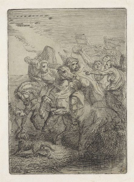 Editor: This is Eugène Delacroix's "Weislingen Attacked by the People of Goetz," and it feels so chaotic. The composition is a flurry of lines. What do you see in its structure? Curator: Indeed. Note how Delacroix masterfully employs chiaroscuro to amplify the drama. The stark contrast between light and shadow accentuates the tension and violence inherent in the subject matter. Observe the dynamic arrangement of forms and the energetic line work, contributing to a sense of turmoil. Editor: So, it's the formal elements themselves that create the feeling of chaos? Curator: Precisely. The artist's skillful manipulation of these elements evokes a visceral response. Editor: I see it now. Focusing on the form really unlocks the feeling.
