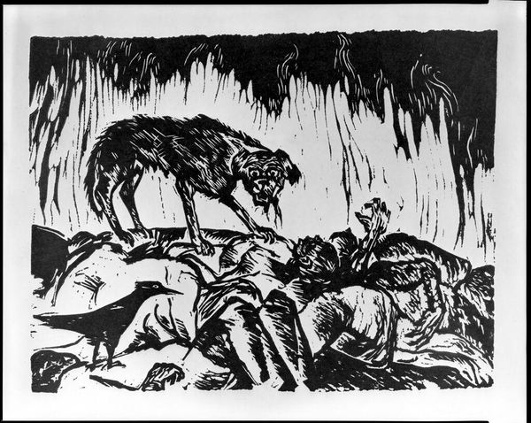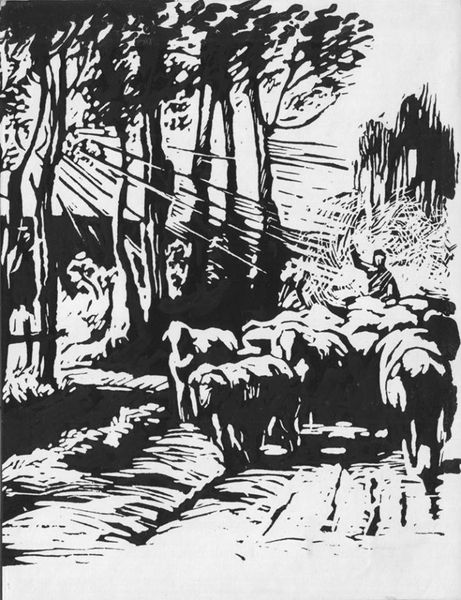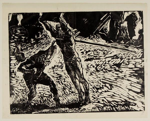 Curator: Here we have Asano Takeji's "Plowing" from the Harvard Art Museums, a stark yet evocative woodblock print. Editor: The bold contrast immediately grabs you, doesn't it? The dynamic interplay of black and white creates a powerful visual rhythm. Curator: Indeed. It reflects the "sosaku hanga" movement, where artists emphasized self-carved, self-printed works. The image likely captured a moment of rural life amid significant social change. Editor: I’m struck by the abstraction; the lines almost become calligraphic, conveying the essence of labor and the animal's brute strength more than photorealistic detail. Curator: It speaks to the democratization of art, moving away from elite traditions and towards representing the everyday lives of ordinary people. The print offered a means of self-expression and a connection to folk traditions. Editor: The composition, though simple, effectively communicates the weight and toil of agricultural work. The limited palette forces the viewer to focus on form and texture. Curator: Studying this work makes one realize how social context shapes artistic production. Editor: And how formal elements work to express it powerfully.
