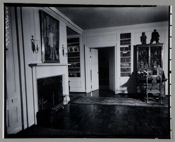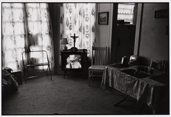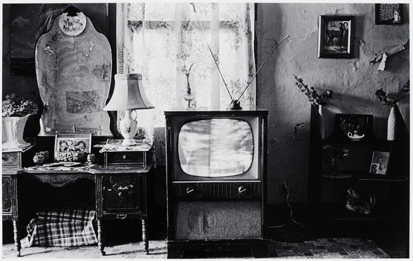 Curator: Dennis Feldman's gelatin silver print, "Jesus and the Lone Ranger – Downtown LA – 1969," offers a compelling interior view. Editor: Initially, the photograph evokes a peculiar sense of domestic solitude, almost bleak. The contrast is quite stark. Curator: The composition stages a dialectic between cultural symbols: the Lone Ranger on television, a crucifix atop the set, and the humble furnishings of the room itself. Editor: The Lone Ranger, of course, representing American heroism and justice, juxtaposed with the Christian symbol of salvation. But is it irony or a genuine connection? Curator: It's a compelling semiotic interplay. The black and white tonality heightens the contrast, visually echoing the moral dichotomies at play within the image. Editor: Right, and the crucifix sits almost as an antenna, drawing spiritual energy from the mediated heroism on the screen. An interesting commentary. Curator: Indeed. The photograph's strength lies in its ability to invite viewers to decode these layers. Editor: It's a thought-provoking glimpse into a moment suspended between faith, pop culture, and the everyday.