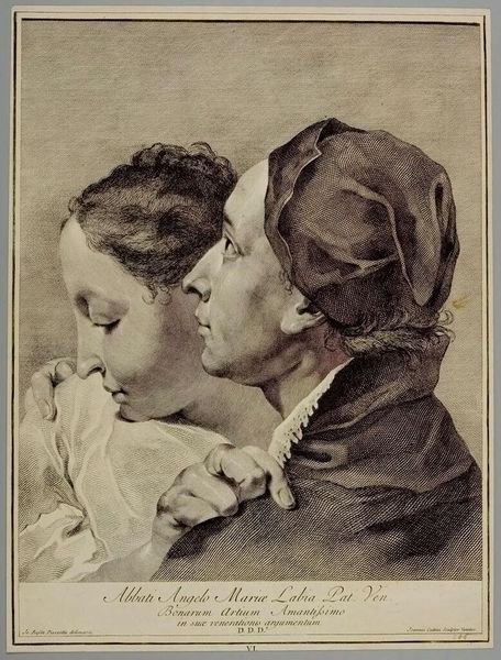 Giovanni Cattini created this print, "Boy with a hat touching the face of a girl," after Giovanni Battista Piazzetta. Notice how Cattini employs contrasting values of light and shadow to model the figures. The darker skin of the boy is set against the lighter complexion of the girl, emphasizing a palpable tension and connection. The composition itself creates a structured yet intimate encounter. Cattini invites us to question not only the relationship between these two individuals but also the broader social and cultural context of representation in the 18th century. The lines etched into the plate are used to create texture and volume, which invite a semiotic reading. The boy's hat, adorned with feathers, and the girl's delicate features, for example, might be seen as signs of status and femininity. Through formal analysis, we come to understand how Cattini destabilizes established meanings, prompting ongoing interpretations of identity, power, and representation within the artwork.