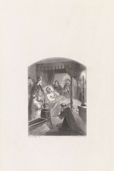 Curator: Here we have Frans Molenaar’s “Beeldenstorm te Amsterdam, 1566,” an engraving rendered between 1854 and 1856. Editor: The immediate feeling is one of violated order. Despite the static nature of print, I can feel the violent upheaval. What's fascinating is how it captures the very moment a dam seems to break. Curator: Yes, observe the deliberate composition: Molenaar directs our gaze from left to right, capturing the surge of figures—note their gesticulations, all unified in purpose as they enact iconoclasm within what appears to be a grand cathedral interior. Editor: And within the chaos, observe how the sacred objects themselves take on significance beyond their material value. The man hoisting what seems to be a religious statue above his head—the act signifies more than mere destruction. It’s a rejection of established power, a visible shattering of ideals. Curator: Precisely. One may decode the arrangement through a binary opposition. On one side, we have the ordered, vertical lines of the classical architecture representing established order, juxtaposed against the diagonals created by the rioters' movements, signifying chaos. The artist sets up this binary, this clear tension through placement and line. Editor: Considering the context, such actions weren’t merely destructive. The image also evokes ideas of reform, rebellion, a reclaiming of religious space by the people. It reminds us how the image itself, even shattered, continues to hold power. What are your thoughts on that central female figure who raises her hands in apparent surprise? She does not appear to belong. Curator: The figure of this startled woman—an interesting element in an otherwise male-dominated scene. Her elaborate dress and refined bearing suggest she represents the very authority being overthrown. Molenaar employs chiaroscuro to dramatize the scene. See how darkness is strategically utilized to heighten the emotional tension? Editor: Molenaar encapsulates the layers of societal tension simmering beneath 16th-century Amsterdam through expressive visual rhetoric. The weight of the scene suggests an end, but the beginning of new symbols yet unknown. Curator: I agree. Analyzing this print’s formal qualities reveals more than the representation of an event. It embodies a potent commentary on structures, power, and societal shifts—a testament to the lasting power of lines, composition, and deliberate arrangement. Editor: This print shows us the enduring echo of symbols. The image serves as a potent reminder that historical events never really vanish. Rather, they’re transformed and revived by our continuing need to grapple with issues of identity, faith, and freedom.
