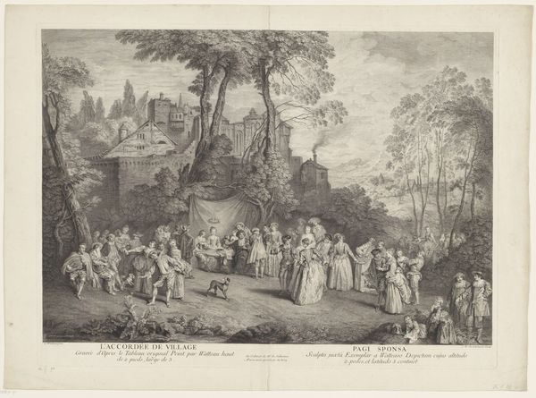 Curator: At first glance, this looks like a stage set, doesn't it? Very theatrical. Editor: Indeed! This is "The Bagpipe" by Jean Moyreau, currently residing in the Harvard Art Museums. It presents a scene of leisure, seemingly in a park. Curator: It strikes me how carefully staged the figures appear, almost as if frozen in poses. Considering the history of such depictions, I wonder what roles these individuals occupy within their social context? Editor: Well, images such as this served important purposes, documenting class and leisure pursuits. How were these kinds of images consumed and what purpose did they serve within the aristocratic visual economy? Curator: I'm struck by the tension between the apparent idyll and the underlying power structures at play. Editor: It certainly encourages us to question the narratives embedded within seemingly innocent portrayals of leisure. Curator: It leaves me contemplating the enduring relevance of these visual representations in understanding social dynamics. Editor: A valuable point to consider, given its display in the Harvard Art Museums.