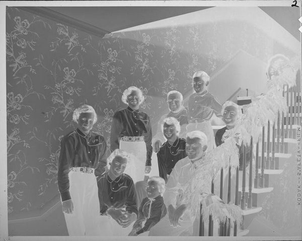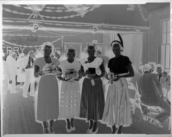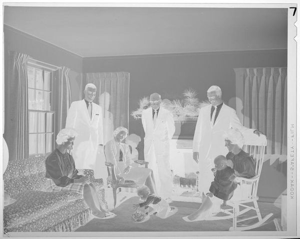 Curator: This photograph by Martin Schweig, currently held at the Harvard Art Museums, captures two young couples alongside an older couple posed in what appears to be a festive gathering. Editor: It's remarkable how the inverted tones lend a ghostly quality, almost as if we're looking at figures emerging from a dream. The high contrast emphasizes the formality of their attire. Curator: Absolutely. Consider the social context—the presence of an older couple perhaps signifies tradition, while the younger ones might symbolize evolving societal norms around relationships and celebrations. Editor: And notice how the composition is structured; the partition and plants visually separate the couples, creating interesting spatial dynamics and inviting a semiotic reading of generational divides. Curator: Indeed, the plants act as a soft barrier, almost a metaphor for the different stages of life and relationships that the figures embody. This imagery reflects Schweig's concern with themes of social transition and family. Editor: Looking closer, I find the texture adds another layer. The slight graininess gives it an authentic, almost nostalgic feel that enhances the photo's enigmatic mood. Curator: Schweig used photography to document and subtly comment on the social mores of his time. It invites us to ponder what aspects of social gatherings have changed and what has stayed constant. Editor: An intriguing photograph that offers rich visual and social commentary.