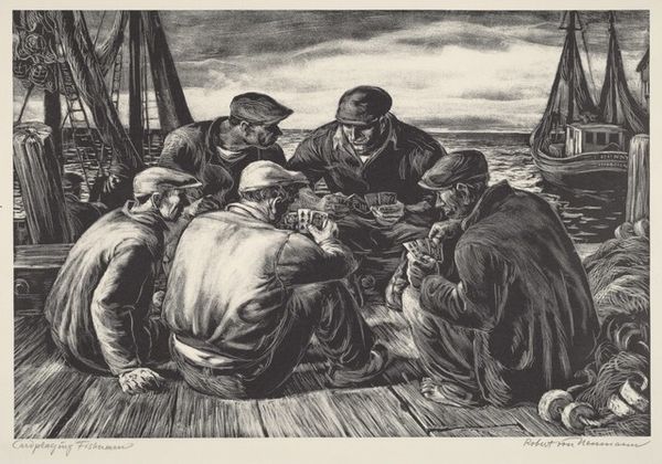 Carl Hugo Beetz created this lithograph, "Untitled (Meeting)," a work without a specified date that encapsulates the socio-economic realities of his time. Born in 1911, Beetz lived through the Great Depression, an era that profoundly shaped artistic expression. Here, we see a gathering of working-class men, their faces etched with a mix of weariness and resignation. The figures are rendered in somber tones, emphasizing their collective struggle and the emotional weight of their circumstances. One man stands, seemingly addressing the group, his posture suggesting authority, yet his face is lined with the same hardships as those he speaks to. The artwork doesn't shy away from depicting the raw realities of class and labor, offering a glimpse into a world where economic hardship and uncertainty were a shared experience. It serves as a reminder of the human cost of economic downturns and the importance of solidarity in the face of adversity.