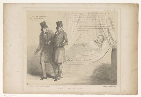 Editor: This lithograph, "Franse artsen buigen zich over de stervende Mazet," which roughly translates to "French Doctors Gather Around the Dying Mazet," was made by Charles Abraham Chasselat sometime before 1833. It’s a pretty stark scene. Everyone looks distraught. What captures your attention most about this image? Curator: It's a powerful image, isn't it? Almost theatrical. The artist captures that very moment of… resignation, perhaps? Everyone frozen in their roles - the concerned doctors, the grieving family, the dying man himself, caught in this suspended animation between life and death. Look at the composition—it’s staged almost like a play. And it gives me the shivers – which is odd because there’s so much life in this death scene! Do you see that too? Editor: I hadn't really considered that tension. All the drama makes it seem so Romantic, you know? With a capital ‘R.’ All that emotional intensity crammed into a single room. What do you make of the almost obsessive level of detail? Curator: Yes, and doesn't the precise line work of the lithograph only amplify the chaos, paradoxically? It's like trying to make sense of the nonsensical – to give death a shape, a story. I love how Chasselat isn’t afraid to fill every corner of the image with texture and feeling; even the wallpaper has a story to tell, doesn’t it? The details make you wonder: what exactly was Mazet to these people? What did they believe they were losing? It leaves you feeling quite haunted, doesn’t it? Editor: Totally. I went in expecting it to feel morose but seeing that tension gives me a lot to think about. Curator: Absolutely, it’s that kind of paradox – that wrestling with the unspeakable – that keeps these historical narratives alive.