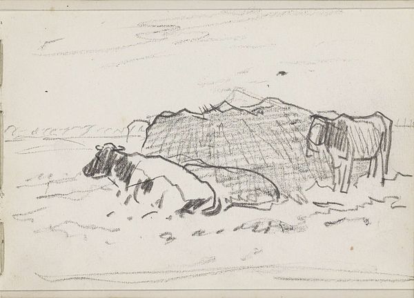 Curator: Looking at this lovely pencil sketch titled "Twee koeien bij een hooibaal"—or "Two Cows by a Hay Bale"—from Anton Mauve, probably created sometime between 1848 and 1888. It resides here at the Rijksmuseum. Editor: There's a certain melancholic stillness about it, isn’t there? Sparse, almost as if captured in a dream, it reminds me of childhood summers. What grabs you first? Curator: The artist's hand, quite frankly! The visible marks, the swiftness, the confident economy of line. Think about Mauve holding that pencil, his perception distilling this pastoral scene into just what's essential. The very making of the image speaks to me. Editor: Yes, the material’s immediacy is crucial! Pencil on paper-- humble materials depicting everyday labor in the fields. Makes you wonder, did Mauve consider himself a craftsman, sketching "studies" for the sophisticated elite? How did this reflect class perceptions about working rural folk, themselves tethered to manual labour? Curator: Perhaps. Though his sensitivity sings louder. I mean, note the languid repose of that cow, almost a curve of quiet contemplation amidst the rough stubble indicated by all those energetic lines. Isn't there something quietly radical in dignifying bovine rest like this? Editor: Radical perhaps if viewed as part of a shift away from formal academic portrayals of animals. The scale too; we're not talking of a massive canvas, are we? Was art becoming more about the fleeting experience accessible to common folks with less to spend? Or feeding into bourgeois fantasies of 'rustic' simplicity? Curator: Maybe both? Art contains multitudes! What intrigues me is how, with just a few graphite strokes, Mauve can suggest texture – the roughness of the hay bale versus the sleek hide of the resting cow. And observe, towards the horizon – is that the faintest line suggesting a treeline? The simplicity invites a kind of active dreaming, does it not? Editor: It absolutely does – inviting deeper engagement with process: the availability of new and portable sketching materials in that period facilitating immediate en plein air capturing of everyday rural sights. Curator: Ultimately, it makes me ponder what “realism” truly means. Is it photographic likeness, or capturing some truth about quiet, essential moments that elude cameras? Editor: For me it brings into sharp focus a quiet observation about everyday farm life that Mauve could easily capture so precisely due to evolving material means in the art world at the time.