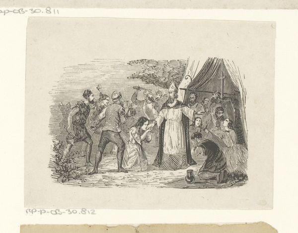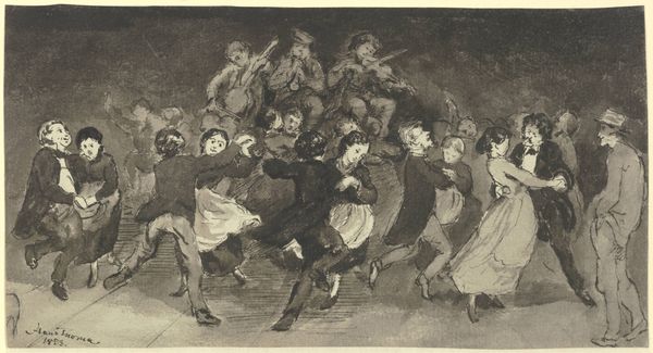 This photomechanical reproduction of a drawing, likely dating back to the late 19th century, captures a scene titled "Peasant Dance." The original drawing, now translated through a photographic process, gives us insight into the intersection of folk culture and early print media. The creation of this image involves a layered approach. First, there was an original drawing. Then, the photographic reproduction transforms the artwork into a distributable commodity. This process democratized art, making it accessible beyond the elite circles who originally commissioned or collected drawings. The resulting image, with its muted tones and textural subtleties, carries its own aesthetic. Consider how this process relates to labor, politics and consumption. While we don't know the names of the people involved in the original drawing, the printing press enabled the mass consumption of images and created a new system of labor. This reproduction sits at the crossroads of art, craft, and industry, inviting us to consider the social and economic context in which it was made.