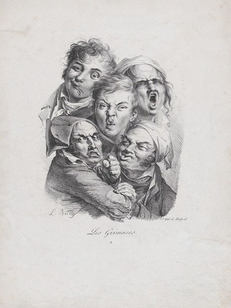 Editor: This is Honoré Daumier's pen lithograph, "Four Men." There's a starkness to the lines that gives it a feeling of unease and tension. What can you tell me about what you see in this piece? Curator: The expressions are so intense, aren't they? Daumier often used caricature to critique society. Noses were considered quite telling. Observe how they are drawn and consider what emotions they might be communicating. Editor: So, he’s using physiognomy here, like a language of the face, to convey something beyond just their physical appearance? Curator: Precisely! And consider how that language might reflect the cultural anxieties of his time. What do these faces tell you about power, status, or even vulnerability in 19th-century France? Editor: It's like Daumier is holding up a mirror to society, exaggerating features to expose deeper truths. I see it now. Curator: Exactly. Symbols can reveal a lot about the cultural memory they carry.