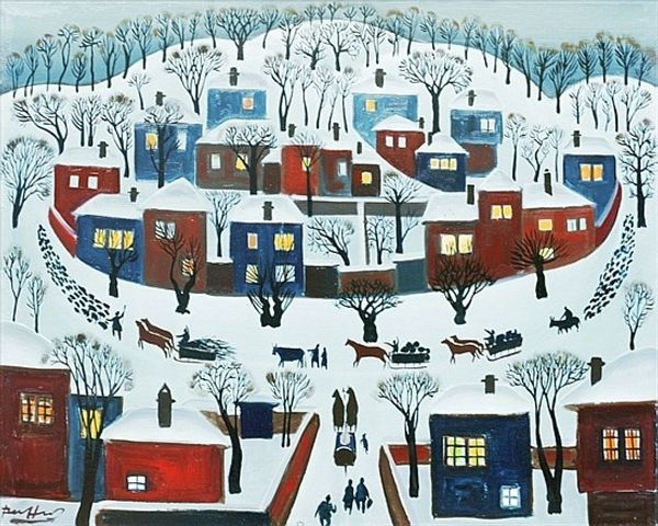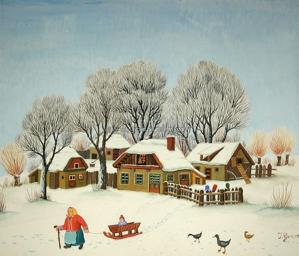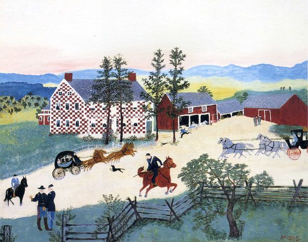 Grandma Moses made "Catching the Turkey" using oil paints and likely a simple brush. Her style recalls the tradition of American folk art, often made by self-taught artists who favored direct representation over academic technique. Notice how Moses eschews realistic perspective and modeling, creating a flattened, almost map-like composition. The application of the paint is quite simple, in broad strokes, and yet captures the energy and vibrancy of a rural winter scene, and everyone's labor is on full display. There's a nostalgic quality to her paintings that connects to the social context of her time. Her works harken back to a pre-industrial, agrarian past, offering viewers a comforting vision of community and self-sufficiency. Moses' painting evokes the sense of collective effort and shared experiences inherent in rural life. Considering the materials and making of art like "Catching the Turkey" allows us to appreciate the artistic value and the labor involved, no matter the simplicity of the medium.