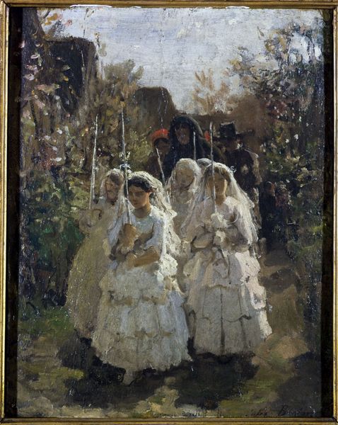 Charles Cottet made this painting, Procession, with oils on canvas. Look at the faces of the women in their white bonnets. Cottet has used visible brushstrokes, layering the paint to capture the textures of their faces. It feels like he’s inviting us to consider art-making as a process. The paint is applied in thick impasto in the women’s headscarves, contrasting with the thin paint of the background and the central Madonna figure. The texture is palpable, almost sculptural. But look at the hands of the women, painted in mottled browns. These earthy, grounded tones resonate with the overall somber mood. It reminds me a little of Paula Modersohn-Becker’s paintings, which also captured the lives of rural women. Like her, Cottet embraces the materiality of paint. He turns it into a form of quiet storytelling, inviting reflection rather than imposing a singular view. It’s this quality that makes the painting stay with you.