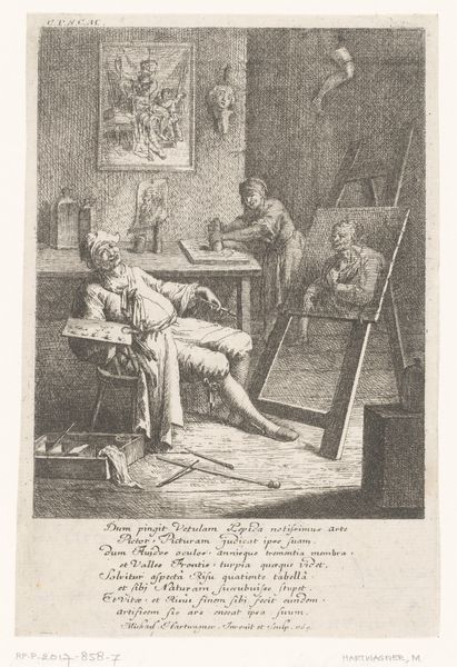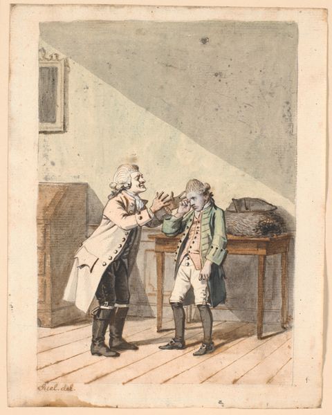 Curator: Look at this rather droll scene; we're looking at "Caricature with Lawyer," made by Pieter van Loon around 1853. The medium seems to be a blend of pen, pencil, and watercolor. It's quite witty, wouldn’t you say? Editor: Witty indeed! My first impression is of muted chaos. The tilted perspective and busy interior, filled with details, contribute to this sense of subtle disarray. The lawyer slumped on the divan really anchors the scene, doesn't he? Curator: Absolutely! The lawyer's pose speaks volumes. Note the use of line throughout. Van Loon’s reliance on delicate but insistent contours not only delineates forms but creates depth through layering. And the choice of watercolor, applied in thin washes, gives it an ephemeral quality. It invites you to see a fleeting moment frozen in time. Editor: And the social commentary seems rather on the nose. The weary lawyer contrasts so sharply with the formally dressed servant carrying in, what I imagine, is an expensive déjeuner. One's worn, the other is proper. What does it mean to be worked to death when one should be dining properly, or, rather, ordentlijt? Curator: It's a delightful rendering of societal tension! I like the idea of social satire meeting romantic sensibility. Though there’s a satirical sting in the lawyer’s droopy form and that overloaded servant, it also hints at vulnerability, don’t you think? Perhaps even empathy toward those caught up in their respective roles? Editor: Yes, a bit melancholic under the jokes, wouldn't you say? What I enjoy is how Van Loon layers detail; the pictures within the picture offer stories of their own, enriching the caricature of a lawyer and painting the genre of labour and social role-play as spectacle! The details like the wonky table are the most engaging aspects of his social commentary. Curator: Exactly, those layers of detail make the piece, giving the sketch not just visual depth but a depth of meaning as well. Thanks for joining me; I see something new in this drawing every time I return. Editor: My pleasure. It is in these nuanced readings that these caricatures begin to transcend simple jokes into timeless pieces!