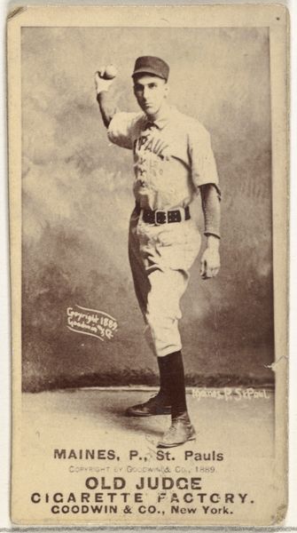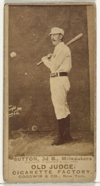 This baseball card of Edward C. "Mouse" Glenn, left fielder for the Sioux City Corn Huskers, was made in 1888 by Goodwin & Company as part of the Old Judge Cigarettes series. These cards existed within a rapidly changing America, a time of growing industrialization and urbanization, but also, racial segregation. The image presents a romanticized vision of athleticism and leisure. Yet, it's impossible to ignore the intertwining of commerce and sport, with baseball cards functioning as promotional items for tobacco companies. This connection highlights how consumer culture was beginning to shape identities and social practices. Moreover, the whiteness of the baseball player, in contrast with the exclusion of Black players from organized baseball at that time, speaks volumes about the racial biases embedded within American society. These biases permeated every level of culture, from the sports field to the advertising industry. This card is both a nostalgic artifact and a stark reminder of the complex ways in which identity, commerce, and social inequality were intertwined in the late 19th century.