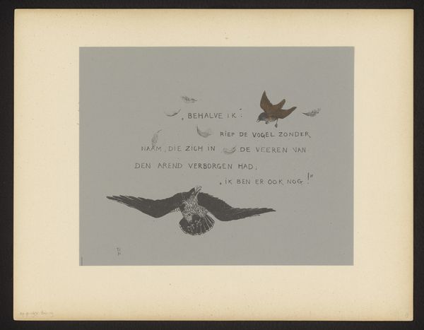 Editor: This is "Vanaf de grond kijkt een groep vogels op naar een biddende arend," which translates to "From the ground, a group of birds look up to a praying eagle," by Theo van Hoytema, created in 1892 using ink and print on paper. There’s a strong sense of…irony, I think? It's whimsical, but feels pointed, almost like a fable. How do you interpret this work? Curator: It is interesting you see irony. Van Hoytema was known for his depictions of birds. Considering this was made in 1892, amidst growing social and political unrest, particularly anxieties about class and authority, do you see any potential metaphors emerging, reflecting the power dynamics of the time? Who does the eagle represent and how does its posture – and the bird's address – feed into this depiction? Editor: So, maybe the eagle represents an elevated figure, like the monarchy or aristocracy, and the smaller birds represent the common people? Is it suggesting a forced, almost sarcastic, admiration? Curator: Precisely. Think about the art institutions of the late 19th century too. They were heavily influenced by the upper classes. Could this image be a subtle critique of the art world, where certain figures and styles are elevated above others due to social standing? The subservient text beneath underscores a forced admiration, hinting at societal pressures and the performative aspects of respect within hierarchical systems. Editor: I never thought about how societal hierarchies influenced art beyond just subject matter, but the very structures presenting art themselves! Thanks. I am starting to see van Hoytema’s pointed intention much more clearly now. Curator: And how the audience can “hail to the king.”
