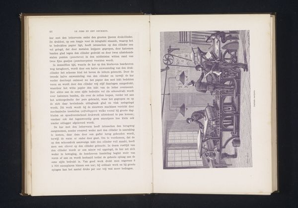 Curator: This book presents a reproduction of an engraving of a paper machine, dating from before 1892. Editor: My initial reaction is one of cool detachment. The crisp lines of the engraving contrast with the hazy atmosphere inside the factory, creating an odd mix of precision and industrial gloom. Curator: Exactly! The rigid depiction emphasizes the mechanics of industrial production, foregrounding the intricate system of rollers and gears. Editor: But isn't it more than just documenting a process? The perspective lines and the placement of the machines create a mesmerizing pattern, turning industrial repetition into a sort of stark beauty. Curator: I see it more as revealing the often unseen labour and material transformations behind a common product—paper. The engraving highlights how industrial machinery has become central to mass media and typography itself. Editor: Agreed, though even these processes generate visual intrigue. The textures of the textiles used, the typography itself, lend a certain rhythm and formal richness beyond mere utility. Curator: To your point, while the composition may seem austere at first glance, the inclusion of human figures subtly injects a social dimension. They emphasize that even within a highly mechanized environment, the labouring bodies matter. Editor: Perhaps. The limited tonal range amplifies the geometric structure and makes it somewhat austere. There is a very powerful composition here, wouldn’t you say? Curator: It indeed reminds us that art's engagement with industry serves as a testament to constant negotiation of labour, materials, and output. Editor: A negotiation ultimately mediated through our aesthetic appreciation. Curator: I think so. Understanding production and materiality enables us to grasp larger cultural systems. Editor: And dissecting the visual order might explain these intricate systems from another perspective.