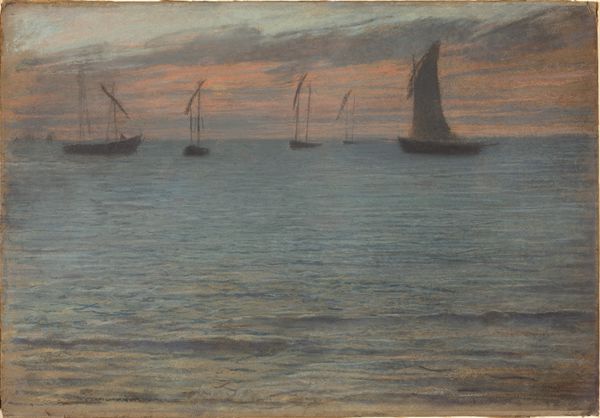 Amaldus Nielsen created this oil on canvas painting to capture a rain shower with sunlight in Cadix. Oil paint lends itself to capturing the stillness of the scene. The slick surface of the oil allows a smooth, glassy finish, reflecting the tranquil sea. Notice how the artist likely applied thin layers of diluted paint, a technique known as glazing, to achieve the subtle variations in tone. This would have allowed light to interact with the painting’s surface, enhancing the effect of light breaking through the rain. But consider the ships themselves: what do they represent? These sailing vessels suggest trade and labor; sailors hauling ropes, merchants transporting goods, and shipbuilders constructing these vessels. By focusing on the material qualities of oil paint, we see how Nielsen elevates what might otherwise be considered a straightforward marine scene, subtly referencing the social and economic networks that once defined the port of Cadix. By focusing on how the painting was made, we appreciate its deeper resonance.