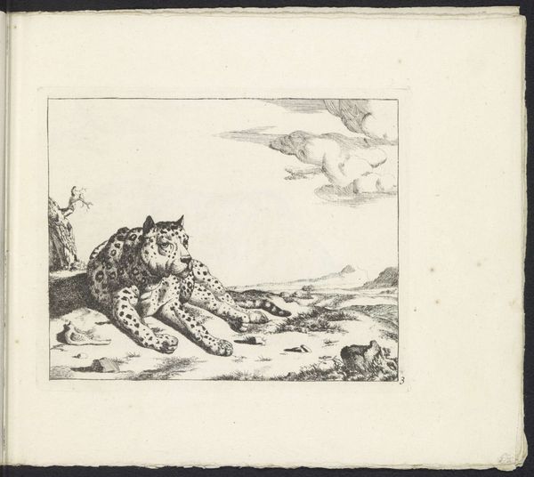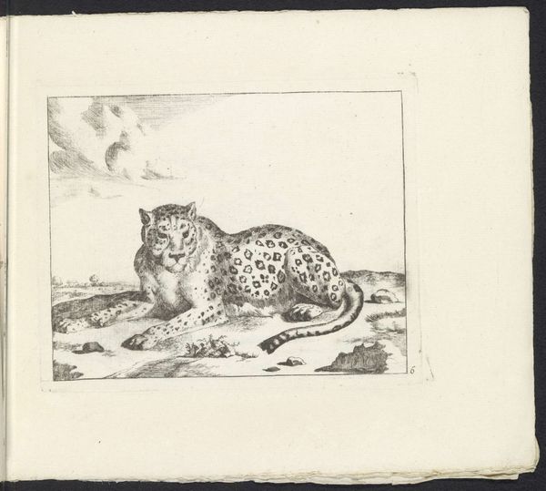 Marcus de Bye created this etching, "Stretched Leopard, facing right," sometime in the 17th century. The print presents a scene dominated by the leopard, its body elongated and poised. The composition, though simple, draws us into the texture of the leopard's fur and musculature. Each spot is carefully placed, and the shading gives volume and depth to the animal's form. The image operates within a tradition of natural history illustration, yet it also presents questions about representation. De Bye captures the leopard in a moment of repose, challenging our expectations of the animal's ferocity. The leopard then, is presented as a signifier of both the exotic and the familiar. It invites us to reflect on our relationship with the natural world and the ways in which we categorize and understand it.