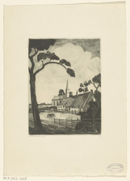 Curator: This pencil drawing, entitled "Rhenen," was created by Jo Bezaan in 1921, and is currently held in the Rijksmuseum. Editor: Ah, yes! Immediately, the subdued tones give it this beautifully serene, almost melancholic feel. The delicate pencil strokes, they create such a hazy atmosphere. Curator: Bezaan's focus here seems to be on capturing the essence of the Dutch landscape, the cityscape, with its iconic church tower rising above the houses. It really emphasizes the relationship between the town and the natural world around it. Editor: It’s all in the composition, isn’t it? See how that solitary tree in the foreground sort of frames the scene? The artist creates a kind of proscenium arch that beckons you into Rhenen's world. I like how that element in the foreground complicates this supposedly simple landscape by inviting an exploration into the deeper themes like time, reflection and even decay. Curator: The artist's masterful control of shading really creates depth and dimension. The foreground appears so tactile. This work is more than just a representational sketch. I mean, even those little ripples in the water seem to contain some narrative suggestion. Editor: You are so right. Speaking of ripples, have you ever considered how they might symbolize life’s constant flow and the transient nature of things? Or even life’s capacity to reflect moments and distort perception? What starts off serene becomes so complicated and thought provoking. That is the beauty of such landscape work! It lets our imaginations run riot, doesn’t it? Curator: It certainly does! And in this little Dutch town it helps you realize art is there whether you’re looking for it or not, just hidden in plain sight. Editor: Hidden in the way those windmills and houses recede into the atmospheric distance, so elusive yet comforting. Exactly! I can see how something so seemingly quiet can have such depth now. Thank you.