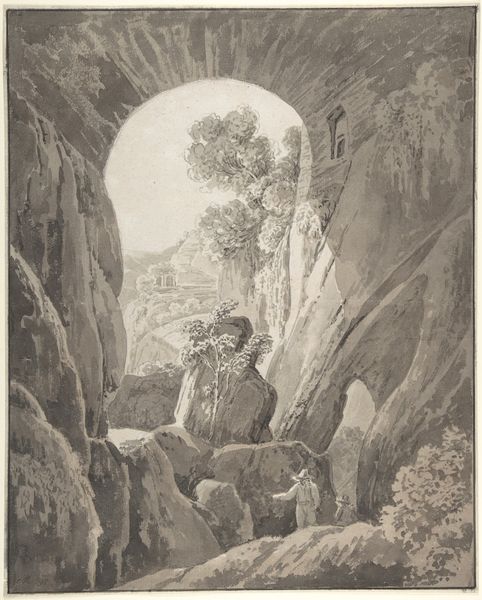 Editor: Here we have Carl Spitzweg's "The Geologist," created around 1860 using oil paint. I'm immediately struck by the contrast between the illuminated geologist and the dark, cavernous space he occupies. It's almost theatrical. What stands out to you when you look at this piece? Curator: It is precisely that contrast, that visual dichotomy, which invites exploration. The geologist himself, meticulously examining his findings, becomes a symbol of humankind's yearning to uncover hidden truths. Think of the cave not merely as a geological formation, but as a visual representation of the unconscious, of the secrets that lie buried within ourselves and the world around us. Editor: That's a really interesting take, especially the comparison to the unconscious mind! It feels like the image suggests not only physical discovery but internal exploration too. Do you see any specific cultural elements reflected in the artwork? Curator: The figure’s pose and garb, coupled with the almost reverential way he examines the rock, evoke a sense of romanticized scientific inquiry popular in the 19th century. What’s more, Spitzweg gives the man both reverence and mockery by hiding him away in what amounts to a small dark opening, creating a figure of the scholar. Do you think that reading is at all persuasive? Editor: Absolutely. I hadn't picked up on the almost humorous angle of portraying him tucked away like that, but now that you mention it, the symbolism makes total sense. It feels like I understand more about the period as well as about human curiosity after this interpretation. Curator: Yes, isn't it amazing how seemingly simple images can speak volumes about cultural attitudes and our enduring quest for knowledge? I've learnt that art challenges perceptions and brings different views to a singular creation.