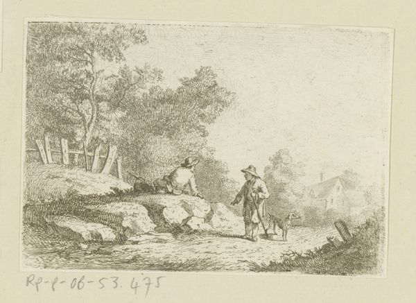 Editor: This etching, "Two goats resting to right...", was created in 1642 by Stefano della Bella. I’m struck by how tranquil and almost mundane the scene is, given the Baroque style; there are just some men with a horse in the background and goats resting nearby. What can you tell me about it? Curator: Look at how Della Bella has positioned the goats so prominently, giving them such detail. Goats are an ancient symbol, often associated with virility, stubbornness, but also, and rather wonderfully here, with provision and nourishment in pastoral life. What do you make of their placement in the foreground in contrast with the tiny men further back? Editor: That's an interesting perspective. I just assumed the goats were, well, just goats! It almost feels like they’re guarding the people in the river, or perhaps they are oblivious to them. Curator: Precisely! And consider the act of "crossing over," which is what the men and the horse are engaged in. In countless cultures, crossing water signifies a transition, a journey, perhaps even a spiritual cleansing. Does this then elevate these figures to those undertaking a kind of symbolic journey, blessed or protected by the foregrounded goats? Editor: I see what you mean! Now I notice how deliberately the goats seem to observe them, rather than just existing. And the choice to use etching lends a certain gravity to this piece. Curator: This isn't simply a landscape, it's loaded with coded gestures, shared cultural memory and continuous re-negotiation, linking us to centuries of pastoral symbolism. Even in supposed tranquility, stories linger. Editor: I'm starting to appreciate how much I miss by not digging deeper into visual clues and symbols. Thanks!