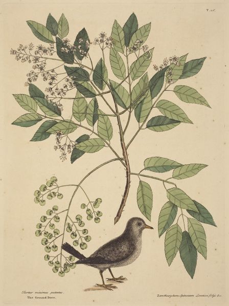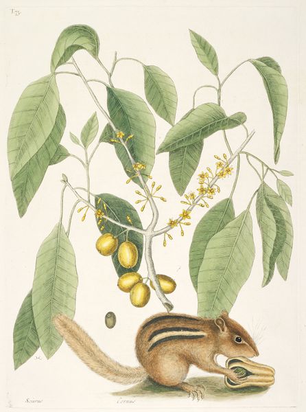 Editor: Here we have Mark Catesby's "The Guana (Lacerta Iguana)," likely created between 1731 and 1743. The work combines watercolor, colored pencil, print, and engraving, which is pretty neat! There's almost a sense of stillness, or suspended animation. How would you interpret this piece, considering its time and methods? Curator: The image presents us with layered symbols. The iguana itself—its association with the exotic "New World"—already signified a place of fecundity and danger in the European imagination. Its placement within a botanical illustration invites a deeper exploration, because plants have consistently conveyed symbolic meaning across cultures. Does the fruit the iguana rests upon suggest knowledge or temptation to you? Editor: Temptation, definitely. The color and almost heart-like shape is quite seductive. The lizard perches right above it, too, so close to what he "desires" I guess? Is there an inherent connection between animals, plants, and, this "New World" that Europeans projected onto their image of it? Curator: Exactly! Notice how Catesby meticulously depicts the iguana and plant. The level of detail emphasizes both the exoticism and the potential for control, through observation and naming. But ask yourself, how does Catesby subtly signal a possible danger in this New World encounter? Is there something uncanny in the creature’s fixed stare and pose? Editor: I hadn't really considered it before, but the way the lizard is posed does feel a little… confrontational? Curator: It directly challenges our gaze, doesn't it? Catesby hints at the agency and potential resistance of the natural world to European classification. What seems like objective observation also holds elements of caution and the untamed. Editor: Wow, I really didn't notice all those layers the first time! The idea of resistance being embedded within this naturalist style illustration is quite fascinating. I’ll remember to look beyond the immediate surface of things going forward. Curator: Indeed. And remember to examine both the scientific intention and the symbolic echoes resonating within such images.