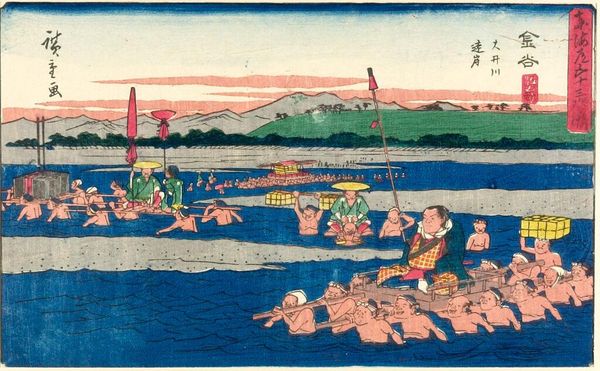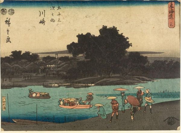 Editor: This is Utagawa Hiroshige's woodblock print, "Gathering Shellfish at Low Tide at Susaki," from his "Famous Places in Edo" series. I'm struck by how it captures a seemingly mundane activity with such vibrant energy. What can you tell me about the social context of this scene? Curator: This image offers a fascinating glimpse into Edo period life. Consider how Hiroshige elevates the everyday activity of shellfish gathering. It wasn't just about sustenance, but also about community and leisure, and how such scenes were consumed by a growing urban audience eager for depictions of their city and its surroundings. How does this commercial aspect influence the way we view the print today? Editor: That’s a really interesting point. It makes me think about how images shape our understanding of history and culture. Thanks! Curator: Precisely. It reminds us that art is not just a reflection of society, but also an active participant in shaping it.